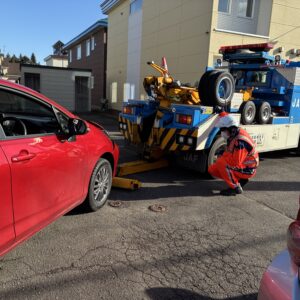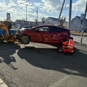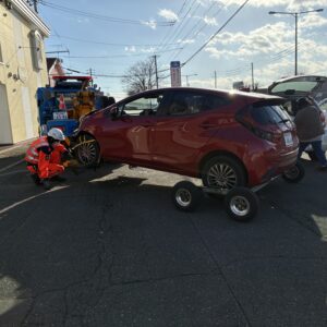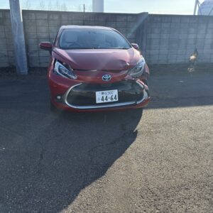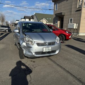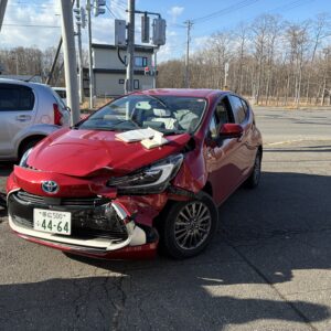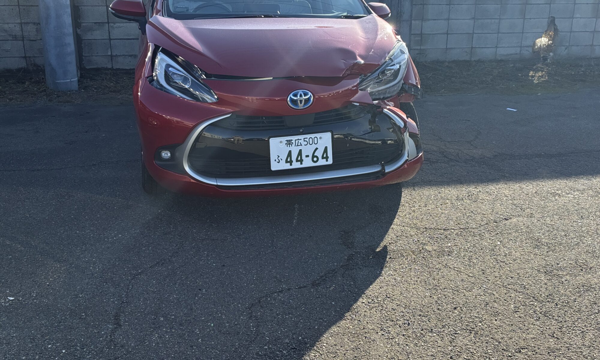 色んな方に助けられて新型を歩道に逃しました。事故後の無残な新型アクア。