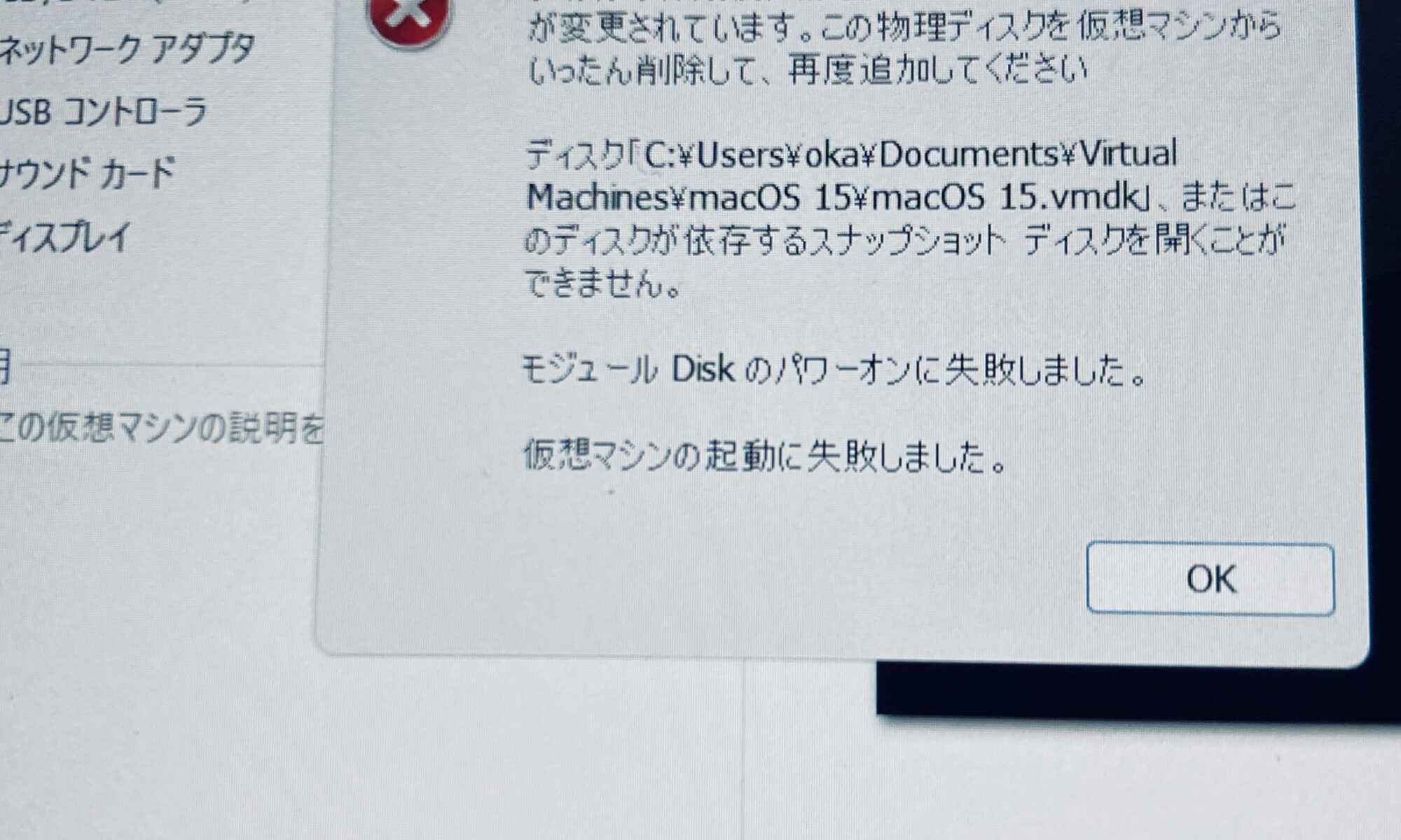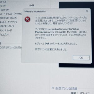 夜に成ってWindows11からVMwareをあげたら、また起動出来ないメッセージが出ました。ガックリ!