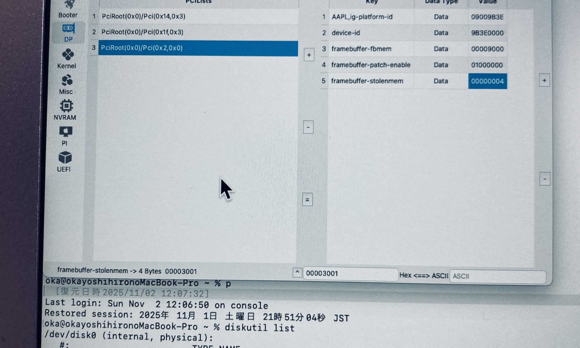パラメータの修正は、macOS用のOCAuxiliaryTools.appをインストールして直接編集しました。